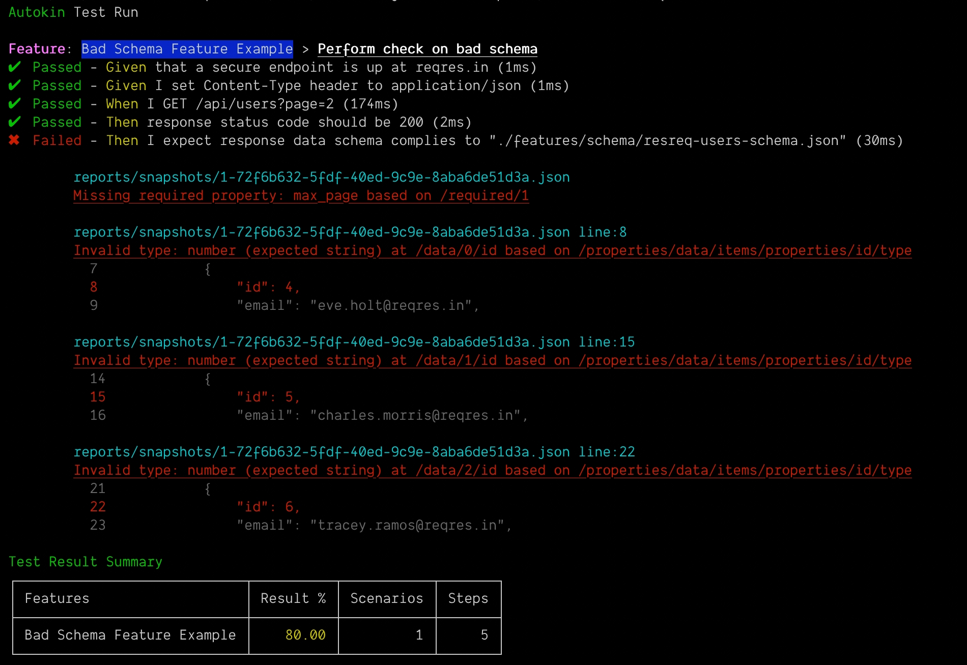 The last line of our test is a check for Schema compliance. Here Autokin will validate if the response does conforms with our expected schema, if not it should report all errors. Below is an example, where exact error will be presented along with the line numbers if available, so that it will be easier for us to debug and identify the problem.